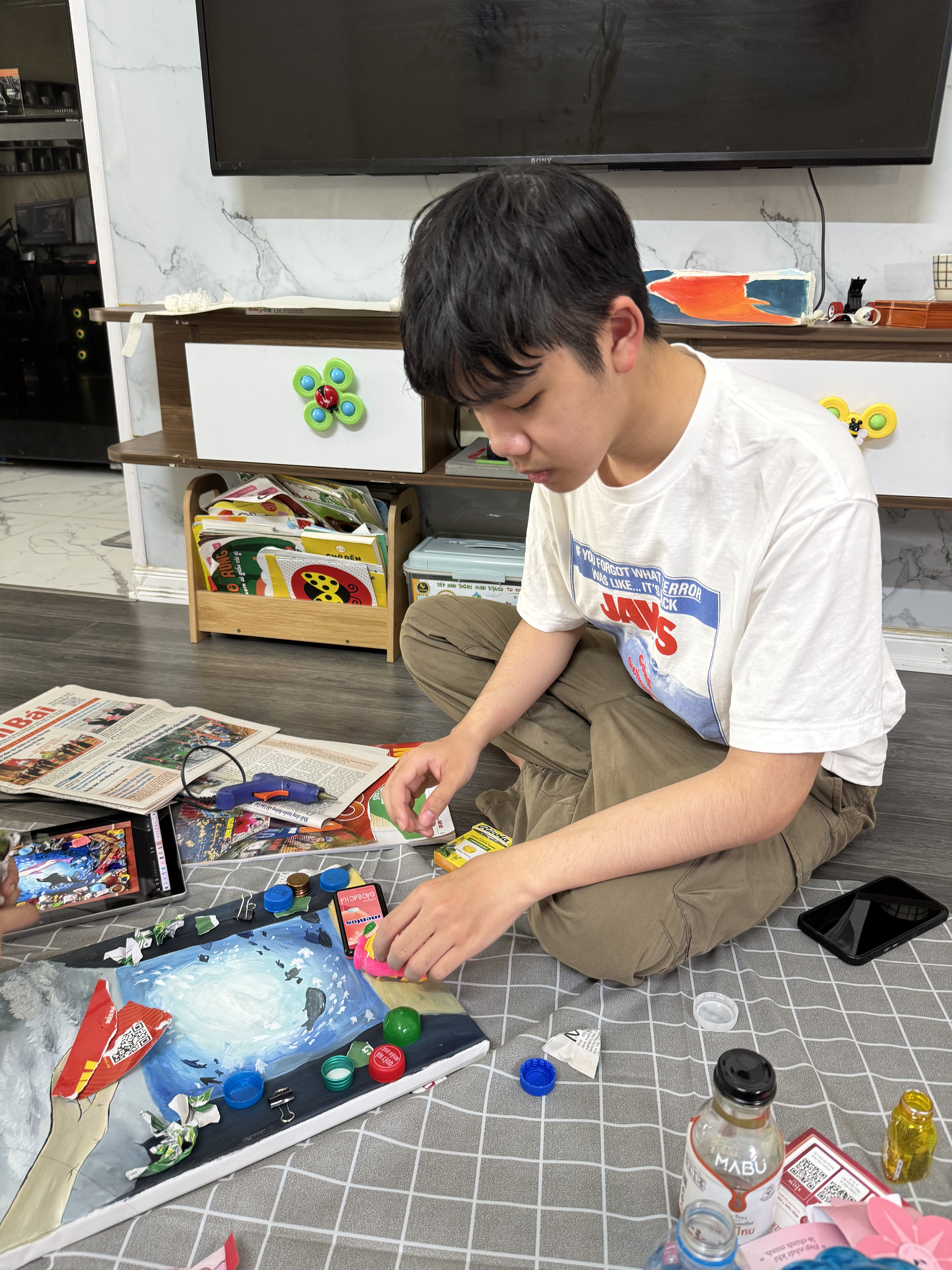 Surrounded by the persistent air and water pollution of Hanoi, I launched this art project. It serves two purposes: to satisfy my own artistic curiosity and to show others my interpretation of pollution’s effects, highlighting both the toll it takes on us and the ways we actively contribute to the problem. I used materials like newspapers, bottle caps, plasitc bags, packages,… in some paintings to create a more powerful message.
